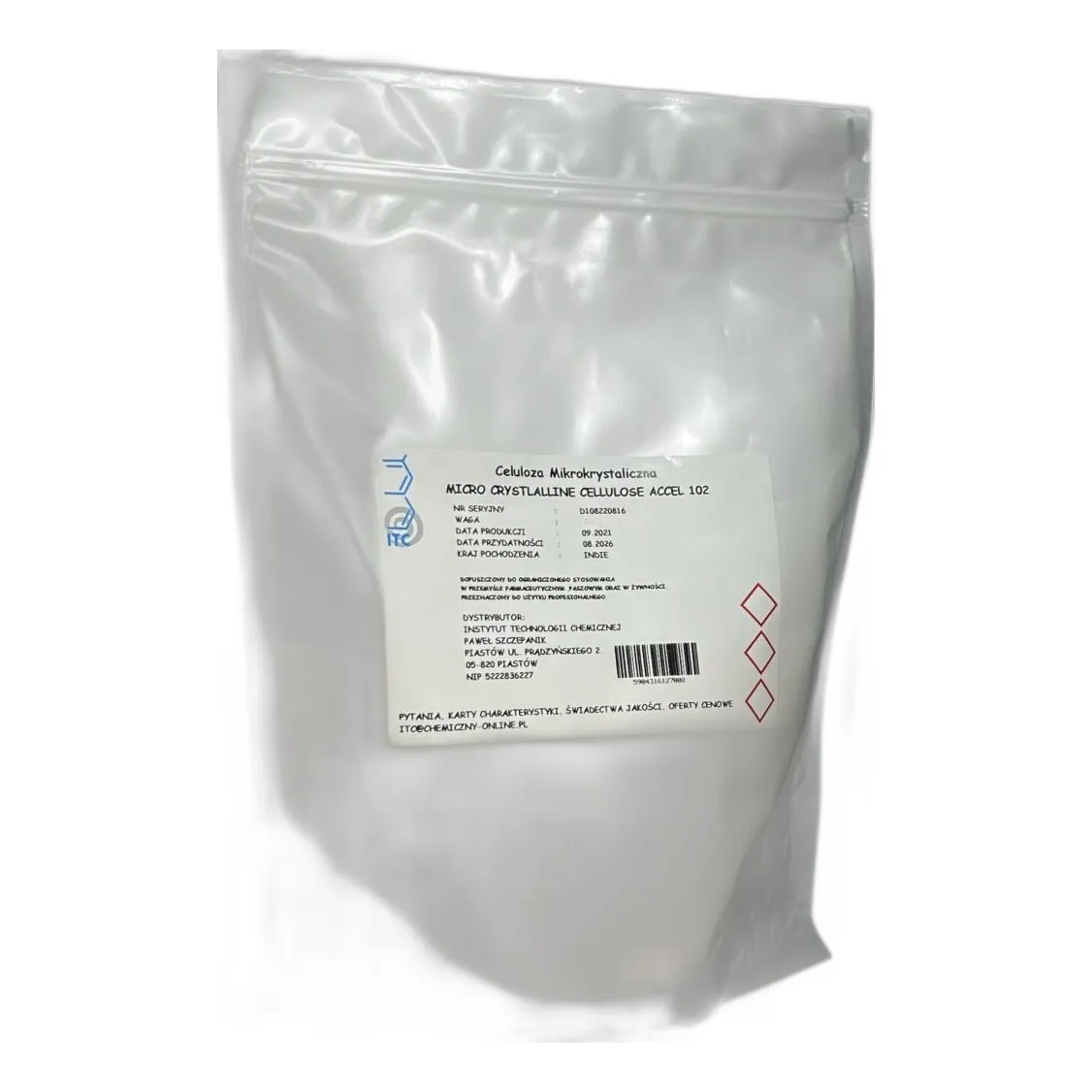Celuloza mikrokrystaliczna to biały proszek stosowany jako wypełniacz w przemyśle farmaceutycznym i spożywczym. Zapewnia dobrą płynność oraz stabilność w formulacjach. Dostępna w opakowaniu 1 kg.
